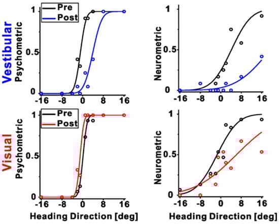 An example session during unsupervised recalibration with simultaneous recording from VIP. The left panels depict the behavioral responses, pre- (black color), and post-recalibration (red color for vestibular condition and blue color for visual condition, respectively). The right panels show the corresponding neurometric curves with fitted cumulative Gaussian functions. Each data point shows the proportion of trials in which an ideal observer would make a rightward choice given the FRs of the neurons. For this example session, the vestibular neurometric curve shifted rightward, in accordance with the vestibular perceptual shift. Interestingly, the visual neurometric curve also shifted rightward, although the visual perceptual shifted leftward. “Reprinted with permission from []. 2023 Fu Zeng”.