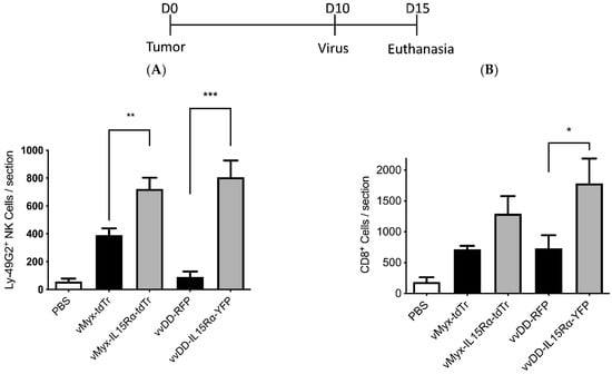 Presence of NK and CD8+ cells in tumor sections of mice in various treatment groups. C57BL/6J mice were implanted with GL261 NS cells i.c., followed 10 days later by injection with PBS, vMyx-tdTr, vMyx-IL15Rα-tdTr, vvDD-CXCL11 or vvDD-IL15Rα-YFP and PBS, vMyx-tdTr, vMyx-IL15Rα-tdTr, vvDD-RFP or vvDD-IL15Rα-YFP; (n = 3) (2 × 106 pfu intratumoral). vMyx-tdTr is the myxoma virus carrying the gene of tdTomato Red; vMyx-IL15Rα-tdTr is the myxoma virus carrying the genes of IL15Ra-IL15 and tdTomato Red. vvDD-RFP is the vvDD vaccinia virus carrying the gene of RFP (red fluorescent protein); vvDD-IL15Rα-YFP is the vvDD vaccinia virus carrying the genes of IL15Ra-IL15 and YFP (yellow fluorescent protein). Mice were euthanized 5 days after the virus treatment and tumor sections were analyzed for NK cells and CD8+ T cells by immunostaining. (A) Number of Ly-49G2+ NK cells per tumor section for each condition; mean values and SEM are shown. One-way ANOVA showed significant increase in NK cell accumulation in vMyx-IL15Rα-tdTr- or vvDD-IL15Rα-YFP-treated tumors, compared to vMyx-tdTr or vvDD-RFP treatments (** p ˂ 0.01; *** p ˂ 0.001). (B) Number of CD8+ cells per tumor section for each condition; mean values and SEM are shown. One-way ANOVA showed significant increase in CD8+ cell accumulation in vvDD-IL15Rα-YFP-treated tumors compared to vvDD-RFP treatment (* p ˂ 0.05). The work for this study was carried out in the laboratory of co-authors Dr. Bingtao Tang and Dr. Edward Roy.