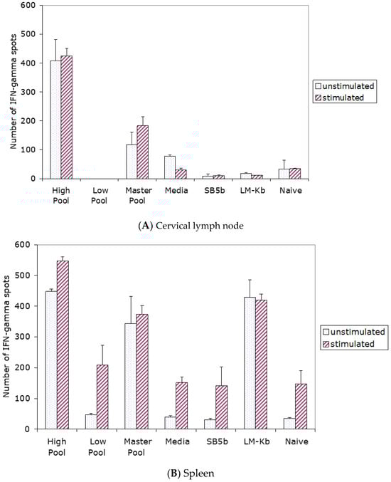 To analyze the development of systemic anti-tumor immunity in tumor-free mice injected i.c. with cells from the various treatment groups, ELISPOT IFN-γ assays for the measurement of responding T cells were carried out using cells from the cervical lymph nodes and spleens from the injected mice. A micro cannula was placed into the right frontal lobe of naïve C3H/He mice. Following the cannula insertion, the animals were injected into the brain through the cannula with 1.0 × 106 cells from the immunohigh pool on two days separated by one week. For the controls, the same procedure was followed, except that the cells from the non-enriched master pool or cells from the immunolow pool were substituted for cells from the immunohigh pool. For the additional controls, the tumor-bearing mice were injected into the brain with equivalent numbers of non-DNA-transfected LMKb cells or with SB5b tumor cells alone. Mice injected with SB5b tumor cells received only one injection. The data revealed that the highest number of responding T cells were in the cervical lymph nodes (Figure 2A) or spleens (Figure 2B) of mice injected i.c. with cells from the immunohigh pool (p < 0.05).