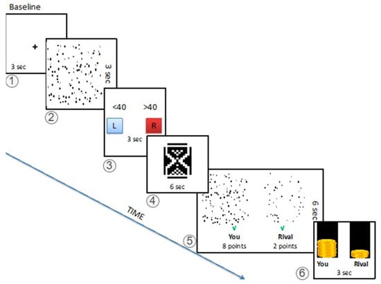 Task Outline. The task begins with a fixed cross for 3 s. Subjects are asked to guess the number of squares in 3 s in a picture with different numbers of various geometrical shapes. After providing their answer, the subjects see an hourglass for 6 s, indicating 10 points being distributed by the referees (anticipating stage). At stage 5, the subjects see both their own and the rivals’ screenshots, and the distribution of the points by the jury. A green checkmark indicates a correct answer, and a red cross indicates a wrong one (the example shows a biased response for the subject even though both competitors had correct answers). The last image shows the distribution of earnings.