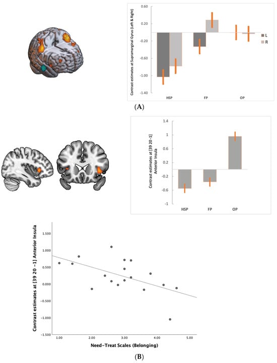 We observed that during FP compared to HSP when the support (bias answers) decreased to fair levels, the BOLD signal decreased in the DMN areas (medial PFC, PCC and angular gyrus—inferior parietal cortex (IPC/pTPJ)) and middle temporal cortex, while there was an increased BOLD signal in the bilateral supramarginal gyrus (anterior TPJ), left dlPFC and visual cortex (Table 1, Figure 2a and Figure 3A). In the OP, as the social support decreased, the BOLD increased in the supramarginal gyrus extending to dorsal parietal regions and visual cortex (Table 2, Figure 2b). Furthermore, we observed activation in the anterior insula and ventral striatum, dlPFC at BA 44 and 10. DMN activity remained low compared to HSP (Figure 2b). The most significant change from FP to OP is increased activity in the anterior insula at BA 13 (Table 3, Figure 3B). Among the need–threat subscales after the game scoring, right AI activity showed a negative association with belonging (r = −0.57 p < 0.05) (Figure 3B).