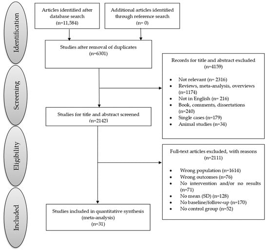 Statistical analyses were conducted utilizing ProMeta 3.0 software (Intenovi 2015, Cesena, Italy). To achieve the primary objectives of the meta-analysis, we calculated effect sizes (ES) from the data reported in the primary studies using the Hedges unbiased approach [24]. Hedges’g-values were interpreted according to the following conventions: values < 0.20 indicated small effects, values around 0.50 suggested moderate effects, and values near 0.80 indicated large effects. Specifically, we examined the following comparisons of interest: (i) individuals with MCI involved in cognitive training (+CT) compared to those engaged in control training (−CT). Positive Hedges’ g-values indicated that individuals with MCI + CT scored higher than those with MCI − CT. Heterogeneity among the studies was evaluated using the Q and I2 statistics index [25]. We explored the impact of demographic and clinical characteristics (such as age, gender, years of education, and type of MCI), type of training (computerized or traditional), mode of training (unimodal or multimodal intervention), and duration of CT (intervention duration in weeks, session duration in minutes, and sessions per week), type of control group (i.e., passive or active), through several meta-regressions. The presence of publication bias was assessed using a scatter plot of estimated ES from individual studies against a measure of study precision (e.g., their standard errors [26]). To ensure a more robust funnel plot analysis, we utilized Egger’s regression method [27]. Furthermore, we employed the trim-and-fill procedure [28] to assess the potential impact of data censoring on the outcomes of the meta-analysis. According to this method, studies that introduce asymmetry in funnel plots are identified and adjusted, allowing for the overall effect estimate derived from the remaining studies to be minimally influenced by publication bias. A p-value of <0.05 was set as the cut-off for significance in all analyses.