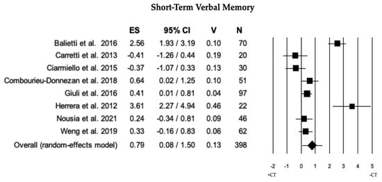 Forest plot for short-term verbal memory (memory domain) illustrating comparison between individuals with MCI involved in cognitive training (+CT) versus those involved in control training (−CT), displaying effect size (Hedges’ g) calculated using a random-effects model. ES = effect size; CI = confidence intervals; V = variance; N = total number of participants [29,31,33,34,40,43,50,59].
