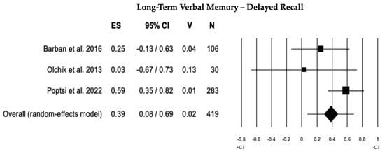 In 4 studies, a comparison of long-term verbal memory between individuals with MCI + CT and those with MCI − CT was conducted. Individuals with MCI + CT exhibited significantly higher scores than those with MCI − CT (ES = 0.31). The heterogeneity across studies was moderate (I2 = 46.86), and there was evidence of publication bias (p = 0.042), although no trimmed studies were identified. A sensitivity analysis recommended the exclusion of one study [33], revealing a significant ES (0.39). The heterogeneity remained moderate (I2 = 45.80), and no publication bias (p = 0.231) or trimmed studies were observed (see Table 2 and Figure 4).
