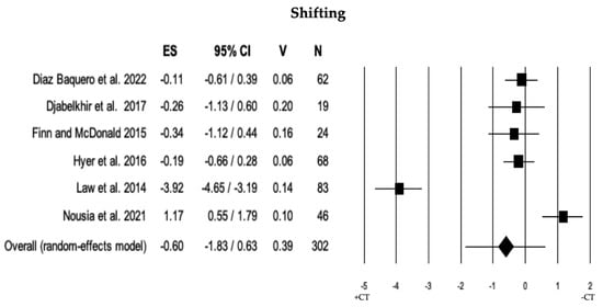 Forest plot for shifting ability (executive domain) illustrating comparison between individuals with MCI involved in cognitive training (+CT) versus those involved in control training (−CT), displaying effect size (Hedges’ g) calculated using a random-effects model. ES = effect size; CI = confidence intervals; V = variance; N = total number of participants [35,36,39,45,47,50].