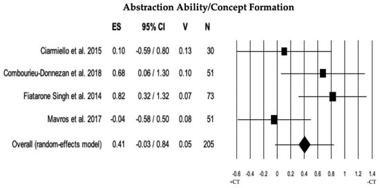 Forest plot for abstraction ability/concept formation (executive domain) illustrating comparison between individuals with MCI involved in cognitive training (+CT) versus those involved in control training (−CT), displaying effect size (Hedges’ g) calculated using a random-effects model. ES = effect size; CI = confidence intervals; V = variance; N = total number of participants [33,34,38,49].