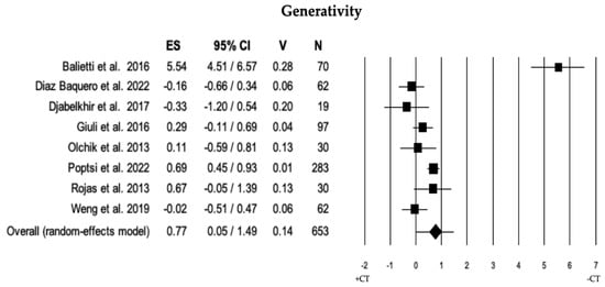 Forest plot for generativity (executive domain) illustrating comparison between individuals with MCI involved in cognitive training (+CT) versus those involved in control training (−CT), displaying effect size (Hedges’ g) calculated using a random-effects model. ES = effect size; CI = confidence intervals; V = variance; N = total number of participants [29,35,36,40,51,52,54,59].