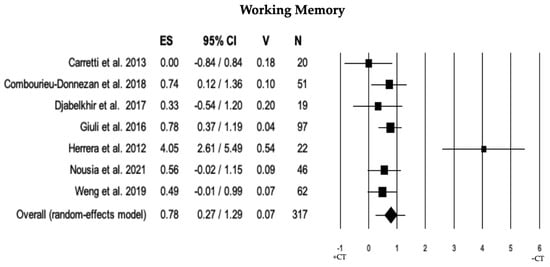 Forest plot for working memory (executive domain) illustrating comparison between individuals with MCI involved in cognitive training (+CT) versus those involved in control training (−CT), displaying effect size (Hedges’ g) calculated using a random-effects model. ES = effect size; CI = confidence intervals; V = variance; N = total number of participants [31,34,36,40,43,50,59].