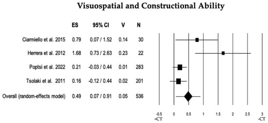 Forest plot for visuospatial and constructional ability illustrating comparison between individuals with MCI involved in cognitive training (+CT) versus those involved in control training (−CT), displaying effect size (Hedges’ g) calculated using a random-effects model. ES = effect size; CI = confidence intervals; V = variance; N = total number of participants [33,43,52,58].