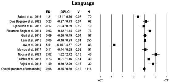 Forest plot for language domain illustrating comparison between individuals with MCI involved in cognitive training (+CT) versus those involved in control training (−CT), displaying effect size (Hedges’ g) calculated using a random-effects model. ES = effect size; CI = confidence intervals; V = variance; N = total number of participants [29,35,36,38,40,46,47,49,50,51,54].