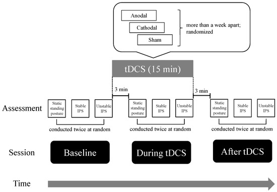 Time course of the experiment. The order in which the participants received the three types of tDCS (anodal, cathodal, and sham) was counterbalanced across subjects. Each type of tDCS was separated by more than a week to avoid carryover effects. The stimulus duration for tDCS was 15 min. Before, during, and after tDCS, the participants randomly performed each postural control task twice in a random order. The static standing posture control task took approximately 0.5 min; the obtention of a stable index of postural stability (IPS) took approximately 1.5 min; and the obtention of an unstable IPS took approximately 1.5 min.