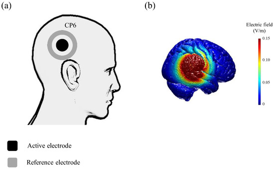 Schematic of tDCS applied to each of the active electrodes. (a) The active electrode (circular type: diameter 4.2 cm) and surrounding reference electrode (ring type: inner diameter 7.0 cm, outer diameter 10.0 cm) were placed on CP6. (b) Electric field simulation.