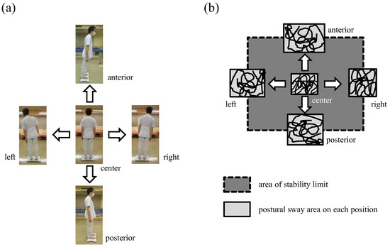 Each IPS was calculated from the log [(area of stability limit + average area of postural sway)/average area of postural sway]. The area of the stability limit was calculated as the area of the rectangle connecting the average center of pressure for the anterior, posterior, right, and left positions (Figure 3b). The average area of postural sway was calculated as the average value of each area of postural sway in the anterior, posterior, right, left, and center positions [22]. The area of the stability limit indicates how far the participants could move forward, backward, rightward, and leftward while maintaining an upright posture, and the postural sway area indicates how much the participants swayed in each directional position. This means that the larger the area of the stability limit and the smaller the postural sway area, the greater the stability of postural control. Therefore, a high IPS indicates good dynamic postural control. In addition, the IPS has been reported to decrease with age, suggesting that a low IPS indicates poor dynamic postural control [22]. The participants were sufficiently familiarized with each postural test before evaluation. Each assessment was conducted twice in a random order with a 1 min break.