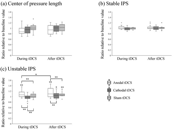 The participants did not report any adverse side effects (headache, intolerable pain, nausea, skin lesions, etc.) during the study. Table 1 shows the baseline values for each parameter before each session of tDCS. A one-way repeated-measures ANOVA showed no significant effect in static standing (F2, 30 = 0.592, p = 0.560) or unstable IPS (F2, 30 = 0.228, p = 0.798) but showed a significant effect on stable IPS (F2, 30 = 4.476, p = 0.020). Post hoc testing revealed that the stable IPS value at the third visit was significantly lower than that at the first visit (p = 0.018). Therefore, we used the ratio relative to the baseline values to evaluate the effect of the stimulation and the period.