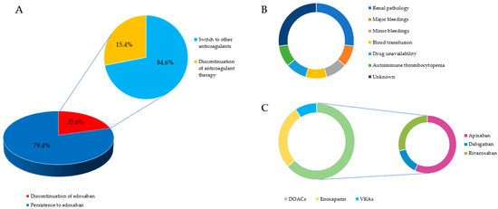 (A) A graphic description of the proportion of patients who persisted and those who did non persist on edoxaban therapy at long-term follow-up, reporting, within the second group, the proportion of patients who interrupted any kind of anticoagulant therapy and those who switched to other anticoagulants; (B) causes of switching to other anticoagulants and their frequency; (C) a list of anticoagulants chosen for switching to with the relative proportions.