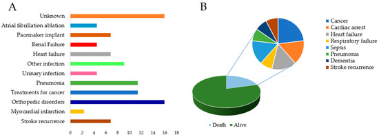 (A) A graphic representation of the various causes of hospitalizations after the index event and their frequencies; (B) a figure depicting the frequencies of the causes of the death in the study sample.