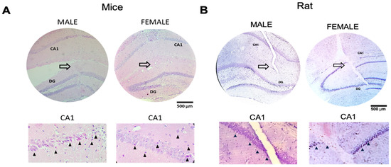 Histology of the hippocampus showing the lesion area (big white arrow), as well as its approach from the CA1 region and dentate gyrus damaged in mice and rats, both female and males (A,B). The arrowhead shows, in the CA1 magnification, the necrotic cells.