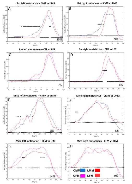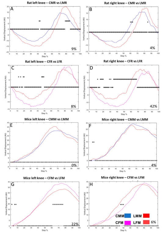 In rats, it occurred in a pendular-like movement (Figure 4A–D), which did not occur in knee mice displacement, which is unidirectional (Figure 4E–H). In rats, the vertical displacement of the knee reveals changes in both sides of males and females. The step cycle LMR changes by 9% (Figure 4A). The CMR on the left hindlimb and 4% on the right hindlimb (Figure 4B). In females, the step cycle of the LFR differs by 8% from the CFR (Figure 4C) and 42% on the right knee (Figure 4D). In mice, the vertical displacement of the knee revealed no changes on the left side of CMM vs. LMM (Figure 4E), but on the right side, 4% of the step cycle was different (Figure 4F). The vertical displacement analyses of LFM show changes in the step cycle of 22% on the left side (Figure 4G) and 6% on the right side (Figure 4H).