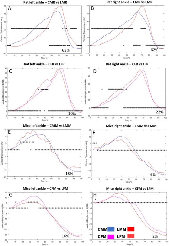 Male rat ankle vertical displacement (VD) in the left (A) and right (B) hindlimbs Ordinate: vertical displacement in arbitrary units (AU), abscise: the step cycle was divided in 100 bins (cycle percentage), asterisks above zero indicate bins with a significant statistical difference (C,D): illustrate the vertical displacement in control and lesioned groups of female rats on the left and right sides, respectively (E,F): Shows mice male vertical displacement of CMM and LMM groups on the left and right sides, respectively (G,H): VD of CFM and LFM groups of the left and right sides, respectively.