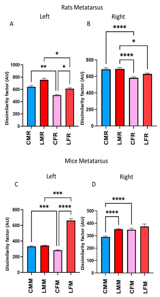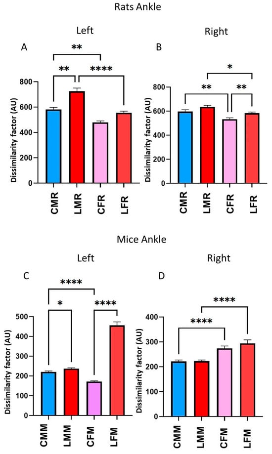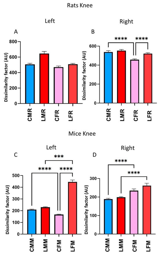 (A,B) rats dissimilarity factor (DF) in the left and right knee joints. The bars in the graphic illustrate CMR, LMR, CFR, and LFR rat groups. (C,D) mice dissimilarity factor (DF) in the left and right metatarsus by knee. They show Mean ± EE values. The statistical differences between groups were calculated using the ANOVA test p ≤ 0.001 (***), p ≤ 0.0001 (****).
