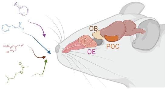 - Todrank, J.; Heth, G.; Restrepo, D. Effects of in utero odorant exposure on neuroanatomical development of the olfactory bulb and odour preferences. Proc. Biol. Sci. 2011, 278, 1949–1955. [Google Scholar] [CrossRef] [PubMed]