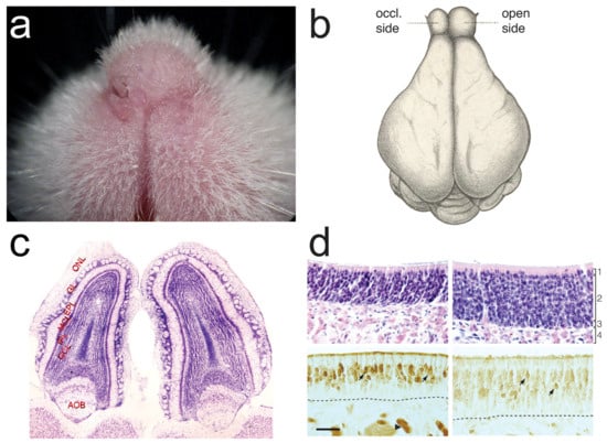 UNO’s structural effects. (a) Adult mouse with left neonatal UNO. (b) Brain illustration of an adult rabbit that had neonatal UNO [4]. Dorsal view is reflected right/left; occl = occluded). (c) Olfactory bulbs in the horizontal section from an adult mouse that had neonatal UNO. All layers of the bulb on the occluded side (left) are thinner than those of the open-side bulb (right). ONL = olfactory nerve layer; GL = glomerular layer; EPL = external plexiform layer; MCL = mitral cell layer; IPL = internal plexiform layer; GCL = granule cell layer; AOB = accessory olfactory bulb. (d) Sections of olfactory mucosa from an adult mouse that had neonatal UNO. Open side (right); occluded side (left); top row is H&E stain; bottom row is OMP immunolabeling (arrows are mature OSN cell bodies); epithelial layers: 1 = sustentacular layer; 2 = olfactory receptor cells; 3 = basal cell layer; 4 = lamina propria. Modified from [10].