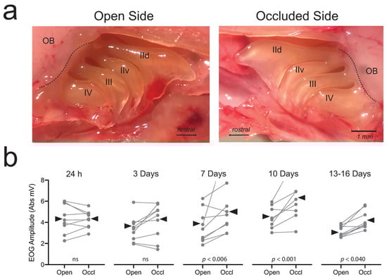 At the physiological level, electroolfactogram (EOG) recordings have been used to investigate compensatory responses to olfactory deprivation. The EOG is an ensemble recording of generator potentials from OSNs measured at the surface of the olfactory epithelium [82,83]. In one study, EOGs were recorded from identical locations on the ipsilateral and contralateral mucosae of UNO mice [84]. Consistent with the transcriptomic and protein findings already mentioned, EOG amplitudes from the occluded side of UNO mice were greater for a given odorant and concentration than those from the open side. These results imply that odor-deprived OSNs develop larger generator potentials or that more OSNs are responsive to a particular odorant, or both. Subsequently, these results were replicated in adult mice (Figure 3) [85,86].