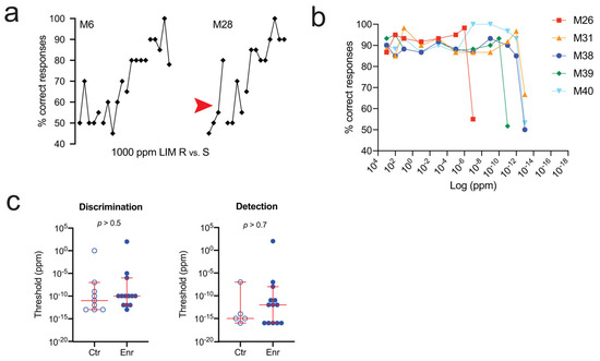 Psychophysical tests of limonene enantiomer from an operant task. Diamond symbols denote the percentage of correct responses for consecutive 20-trial blocks. Read the plot from left to right. Lines connect blocks from the same session. (a) Data from two mice naïve to odorants learning to discriminate 1000 ppm limonene (LIM) R vs. S. As was typical, mice made progress on the task within a couple of sessions. Mouse #28 (arrowhead) performed above chance after 40 trials. (b) Performance of five subjects discriminating decreasing dilutions of limonene progressing to the threshold (seen as a precipitous decline in percent correct). The discrimination task was S vs. R + S where R and S are two stereoisomers of limonene at 1000 ppm stock solution in mineral oil. Symbols are the percent correct for an individual mouse in the last two blocks of trials. (c) Threshold discrimination and detection for limonene. Mann–Whitney p-values are shown. Note: limonene enrichment did not affect median discrimination or detection thresholds (see text). Modified from [157].