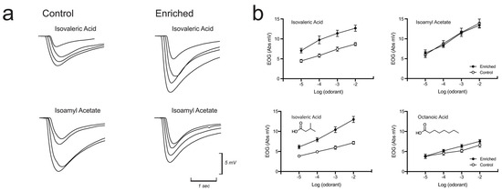 In another study, mice exposed from birth to PND33 to octanal, either on a pulsed or continuous schedule, showed a decline, compared to controls, in their EOG response to this odorant [115]. In the same study, proteomic analysis of enriched and control mucosae revealed a down-regulation of odorant-binding proteins from the enriched group.