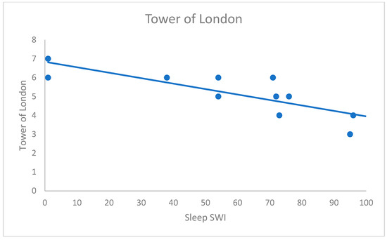 The results are summarised in Table 3. Our results showed a statistically significant negative correlation between the awake EEG score and the Block Tapping Test (rs = −0.73; pcorr < 0.05), highlighting that higher awake EEG score is associated with poorer performance in visuo-spatial short-term memory (Figure 1). Patients with higher sleep SWF also tended to have lower scores on the Block Tapping Test, but this tendency did not reach statistical significance after Bonferroni’s correction (rs = −0.58; pcorr = 0.196). Additionally, we found a significant negative correlation between sleep SWI and the Tower of London (rs = −0.87, pcorr < 0.05). In other terms, the higher the sleep SWI, the lower the score in this visuo-spatial planning task (Figure 2).