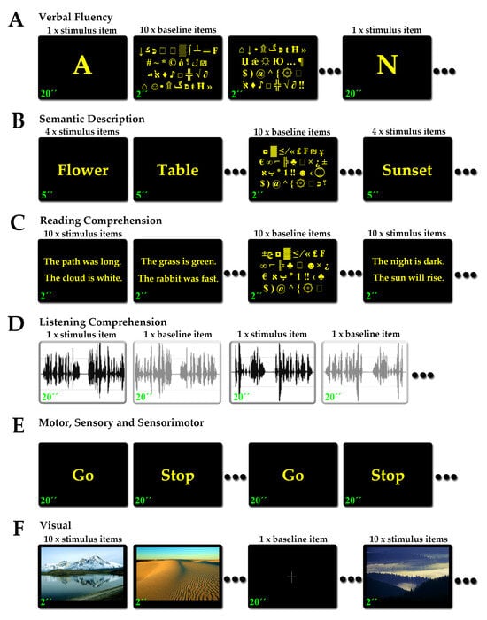 Flowcharts of the fMRI tasks. (A) Verbal fluency task: patients were presented with a single letter and were instructed to silently generate words starting with that letter. (B) Semantic description task: patients were presented with a single word of objects and tools of household and urban life and were instructed to silently generate a complete sentence with a definition for this object or a description of its common use. (C) Reading comprehension task: patients were presented with sentences of brief factual statements and were instructed to read them silently as soon as they appeared on screen. (D) Listening comprehension task: patients were asked to listen carefully to a pre-recorded narrative and be prepared to answer questions on the content. (E) Motor, sensory and sensorimotor tasks: the patients were presented with the simple instructions “Go” to begin the activity and “Stop” to stop the activity. During the sensory task, “Go” and “Stop” were instructions for the functional neuroimager who was performing somatosensory stimulation. (F) Visual task: the patient was instructed to visually explore the complex colorful images. Durations for each item appear in green on the left lower corner of each item; this was not part of the presentation to the patients.