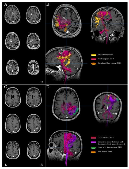 Examples highlighting the strategy and rationale of functional and structural peri-lesional coverage. Anatomical localization and morphological depiction (A), along with fMRI and DTI-tractography mapping (B), on post-G Gadolinium T1-weighted images for a precentral tumor. Anatomical localization and morphological depiction (C), along with fMRI and DTI-tractography mapping (D), on post-Gadolinium T1-weighted images for a central tumor.