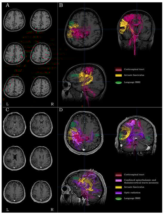 For lesions residing in the inferior parietal lobule/posterior temporal region (Brodmann areas 39, 40, 41, 42 and 22), especially in the language-dominant hemisphere, the main surgical concerns were the proximity to Wernicke’s area, the proximity to the inferior post-central gyrus and the integrity of the arcuate fasciculus. For such lesions, the mapping process included language fMRI and DTI-tractography of the ipsilateral arcuate, the combined spino-thalamic/thalamo-cortical tracts (optionally accompanied by the cortico-spinal tracts, depending on the anterior extent of the lesion) and the optic radiation (Figure 3C,D).