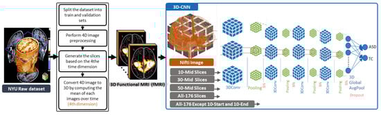 As illustrated in Figure 2. the fMRI modalities are processed differently. As fMRI are 4D images representing simple time-series or multi-volume data, different numbers of slices were generated based on the fourth dimension (i.e., time) whereby the first three dimensions represent axial, sagittal, and coronal planes. Specifically, 10, 30, 50, all slices, and all slices except 10-start slices and 10-end slices were considered. To calculate the mean of the images over time or the fourth dimension, it is important to note that if a list of 4D images is provided, the mean of each individual 4D fMRI image is computed separately, and then the resulting means are computed together resulting in 3D fMRI images. These 3D images were then normalized FCM-based tissue-based normalization [48], and used as input to the proposed 3D-CNN, following a similar architecture as the sMRI experiment. The objective of using the same 3D-CNN model was to assess the performance of ASD diagnosis using the generated sMRI and fMRI datasets.