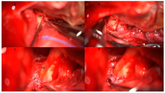 Step-by-step illustration of a cisternostomy performed during microsurgical clipping of an aneurysm of the right middle cerebral artery bifurcation. (a) Subfrontal approach and identification of the optic nerve (ON) with (b) progressive opening of the optico-carotid cistern and exposure of the internal carotid artery (ICA). (c) The dissection continues medially and posteriorly following the ON until the exposure of the optic chiasma (OC) and the lamina terminalis (LT). (d) The opening of the lamina terminalis gives access to the third ventricle and allows CSF drainage from the ventricular system. Brain relaxation is generally obtained at this stage after blood clot evacuation from the basal cisterns, the opening of the optico-carotid cisterns, and the LT. Abbreviations: CSF: cerebrospinal fluid; ICA: internal carotid artery; LT: lamina terminalis; OC: optic chiasma; ON: optic nerve.
