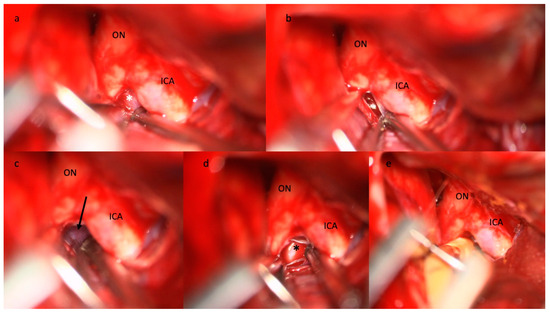 Step-by-step illustration of a cisternostomy performed during microsurgical clipping of an aneurysm of the right middle cerebral artery bifurcation. (a) The diencephalic leaf of the Membrane of Liliequist (white asterisk) is seen through the optico-carotid triangle and (b) progressively opened, (c) enabling the exposure of the mesencephalic leaf (black arrow) that is finally opened. (d) The basilar artery (black asterisk) is visible in the pre-pontine cistern. (e) The tip of the cisternal drain is positioned between the ICA and the ON in the pre-pontine cistern. Abbreviations: ICA: internal carotid artery; ON: optic nerve.