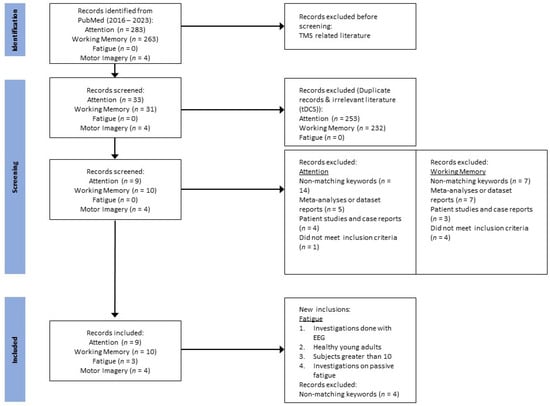 The search on PubMed conducted in May 2023 (Figure 1) for articles from 2016 to 2023 yielded 4 articles for “motor imagery”, 283 articles for “attention”, 263 articles for “working memory”, and none for “fatigue”. Upon removal of duplicates and transcranial direct current literature, which is irrelevant to this review, it yielded 33 articles for “attention”, 31 articles for “working memory”, and none for “fatigue”.