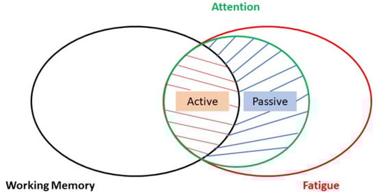 A Venn diagram illustrating the cognitive implications amongst three domains: working memory, fatigue, and attention. Active fatigue affects attention and working memory; passive fatigue mainly impacts attention.
