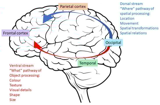 Attention can be defined by two sub-processes: covert and overt attention. Covert attention is said to be sustained by the brain’s attentional network driven by goal-directed intentions without physically attending to a stimulus, while overt attention is debated to be the by-product of covert attention in which a saccade is made to fixate on a stimulus with a goal-directed intention []. When attending to a stimulus, visual information is first encoded by the primary visual area (V1) and is then transmitted via two main streams of processing pathways: the dorsal and ventral pathways [], (Figure 4). While the former directs sensory information flow to the posterior parietal cortex, a region implicated in visuospatial perception and planning, the latter directs information flow to the inferior temporal cortex, a region implicated in stimulus recognition. Primate studies showed that an enhancement in neuronal firing rates recorded in the visual attention network does not truly reflect attentional effects []. Fixating on a stimulus and having it in the receptive field of neurons to trigger firing does not imply that one is actively processing the stimulus. Instead, both increases and decreases in firing rates of the neuronal populations mediate the overall stimulus encoding process to result in conscious attention. This synchronization of population-wide firing rates across cortices in the attention network supports the notion that modulations in respective oscillatory frequencies could be picked up by EEG recordings. Since motivation can be deemed as a goal-directed control of attention, outcomes measured from attentional tasks can also be used to validate an individual’s motivation.