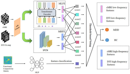 Major depressive disorder (MDD) is a prevalent mental health disorder that has a significant impact on both the individual and society [1]. It often presents as a severe and enduring depression that is accompanied by a variety of physical and mental symptoms. The utilization of clinical data and advanced imaging techniques in the investigation of depression [2,3] can aid healthcare professionals in achieving a precise diagnosis. Presently, imaging technology continues to advance at a rapid rate. Due to their non-invasive ability to provide a more comprehensive insight into the mechanistic abnormalities associated with disease pathology, both diffusion tensor imaging (DTI) and functional magnetic resonance imaging (fMRI) have become prominent tools in the field of MDD research and diagnosis. Specifically, DTI can illuminate the structural and anisotropic attributes of the brain’s white matter fibers by tracking the diffusion patterns of water molecules, which provides a more profound understanding of the brain’s communication system. Additionally, using BOLD signals for studying changes in brain function is one of the fundamental methods of fMRI.