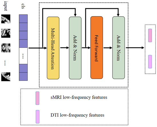 Low-frequency information typically signifies slowly evolving structural characteristics and global patterns, corresponding to alterations occurring over longer spatial or temporal scales. This enables the capture of macroscopic brain structural features. In this module, we devised the meta-component for low-frequency feature extraction responsible for acquiring low-frequency feature information from FAM and sMRI, as depicted in Figure 2. The transformer encoder [22] element served as the foundation for our design in this module.