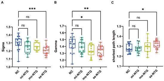 Box line chart of the Sigma, Gamma, and shortest path length between the NC and NTG subgroups. The comparisons between the NC and NTG subgroups showed a significant decrease in Sigma values for severe NTG, a decrease in Gamma values for moderate and severe NTG, and an increase in shortest path length for severe NTG. Sigma, the small world index; Gamma, normalized clustering coefficient; * p < 0.05, ** p < 0.01, *** p < 0.001, ns p > 0.05 (1-way ANOVA, Dunnett’s post hoc test).