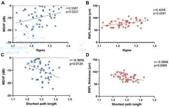 Scatter plots with regression lines showed the correlation between MDVF scores and Sigma (A), RNFL thickness and Sigma (B), MDVF scores and shortest path length (C), and RNFL thickness and shortest path length (D) in NTG patients. Sigma, the small world index; MDVF, mean deviation of visual field; RNFL, retinal nerve fiber layer.