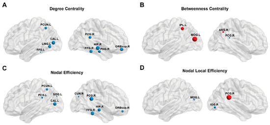 Three-dimensional view of brain hubs with differences between healthy controls and NTG patients. The brain map shows specific regions whose nodal property values including degree centrality (A), nodal efficiency (B), betweenness centrality (C), and nodal local efficiency (D) are higher (red) or lower (blue) in patients with NTG compared with controls. Node size: T-values for differences in nodal properties between the NTG group and healthy controls.