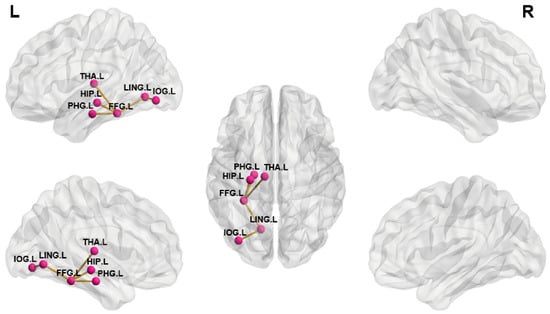 As shown in Figure 4, the subnetworks that showed significant differences between groups were identified. Compared to HCs, NTG patients showed significantly stronger structural connectivity in a subnetwork comprising six brain regions and five connections. This subnetwork involved the left thalamus (THA.L), HIP.L, PHG.L, FFG.L, LING.L, and IOG.L. All of the above brain regions are directly connected to the FFG.L, except for the IOG.L, which is connected to the LING.L.