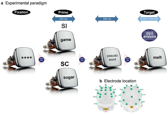 The experimental paradigm (a) and EEG recording locations (b). A priming paradigm was used to investigate explicit and implicit semantic processing. A prime word in Japanese was presented 500 ms after the fixation (****) appeared, for 300 ms. Subsequently, a pseudo-word appeared for 300 ms with an inter-stimulus-interval of 500 ms. Finally, a target word was presented with the same inter-stimulus interval and remained on the screen until the participants’ button response. The experimental stimuli comprised SC and SI prime–target pairs. EEG signals were recorded from the 34 scalp locations indicated by the numbered light-green nodes and were analyzed to evaluate neural responses to the target words.