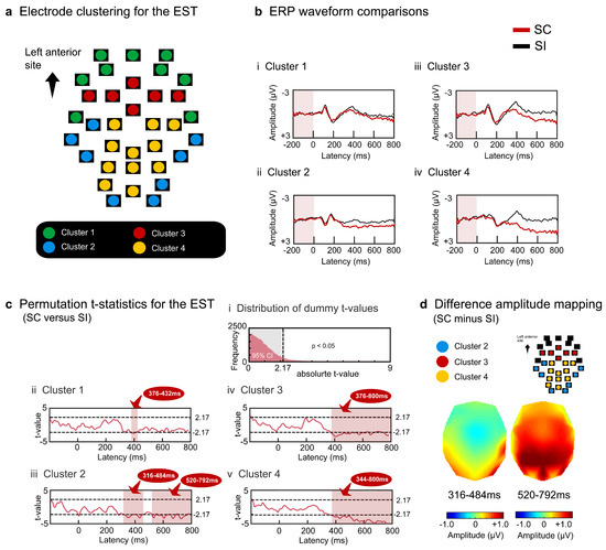 Surface potential analysis results for the EST. The grand-averaged ERP waveforms of the 34 electrodes were initially grouped into four clusters based on the hierarchical clustering method (a). The waveforms in each cluster were averaged for each participant, and the grand-averaged waveforms for the four clusters were compared between the SC and SI (b). Amplitude differences between the SC and SI were statistically tested using permutation t-tests (c). The light red-colored areas indicate intervals with significant differences between the two conditions (|t| > 2.17, p < 0.05 corrected). Scalp distributions of the difference amplitudes (SC–SI) were mapped for the two intervals (d). The dark red-colored areas represent more positive amplitudes.
