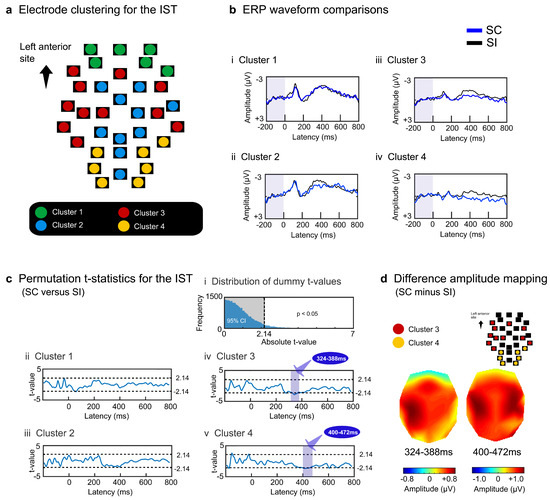 For the IST, the four electrode clusters were separated with regard to semantic congruity ERP effects (Figure 3a). Cluster 1 (green) was located at the most anterior frontal site and did not show a significant difference between the SC and SI (Figure 3bi). Cluster 2 (blue) appeared at the midline centroposterior site, yielding reduced negative potentials for the SC at approximately 400 ms (Figure 3bii). Cluster 3 (red) was located at the bilateral temporal sites, yielding transient reduced negative potentials for the SC at approximately 400 ms (Figure 3biii). Cluster 4 (yellow) appeared at the most posterior sites, including the occipital areas, and showed reduced negative potentials for the SC after approximately 400 ms (Figure 3biv).