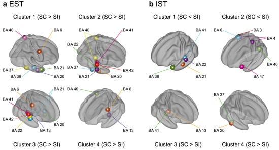 Three-dimensional cortical mapping of BAs that exhibited significant differences in activation between the SC and SI in the EST (a) and IST (b). Three-dimensional coordinates of each BA are determined by averaging the coordinates of voxels with the same BA label in each cluster. The numbers of the four clusters correspond to those previously shown in Figure 4 and Figure 6 for the EST and IST, respectively. For the EST, the right temporal BAs showed greater activation for the SC than for the SI (clusters 1 to 4). For the IST, the left superior and middle temporal areas (BAs 21, 22, 38, and 41) exhibited reduced activation for the SC than for the SI in earlier intervals (cluster 1). Conversely, several right superior and inferior temporal areas (BAs 20 and 41) showed greater activation for the SC than for the SI during later intervals (clusters 3 and 4).