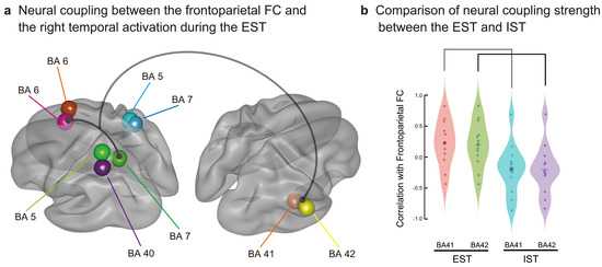 Left frontoparietal FC showed a significantly higher positive correlation with source activity in the right temporal areas for the EST than for the IST; these right temporal areas were restricted to the primary auditory cortex (BAs 41 and 42). Left frontoparietal FC, increased by visual word attention, was assumed to promote nondominant auditory processing in a cross-modal manner. This suggests that phonological processing, such as selective phonological attention [74,75] and phonological repetition [76], was reproduced for recalling congruent primes to help high-load semantic judgement during later processing stages, with neural coupling between the frontoparietal FC and neural activation in the right primary auditory areas.
